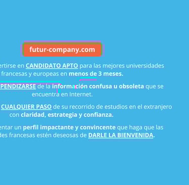 En FUTUR & CO, ayudamos a los estudiantes latinoamericanos a construir un proyecto de estudios sólido, alineado con sus ambiciones personales y profesionales. Nuestra misión es transformar un sueño a veces difuso en un camino concreto y exitoso.